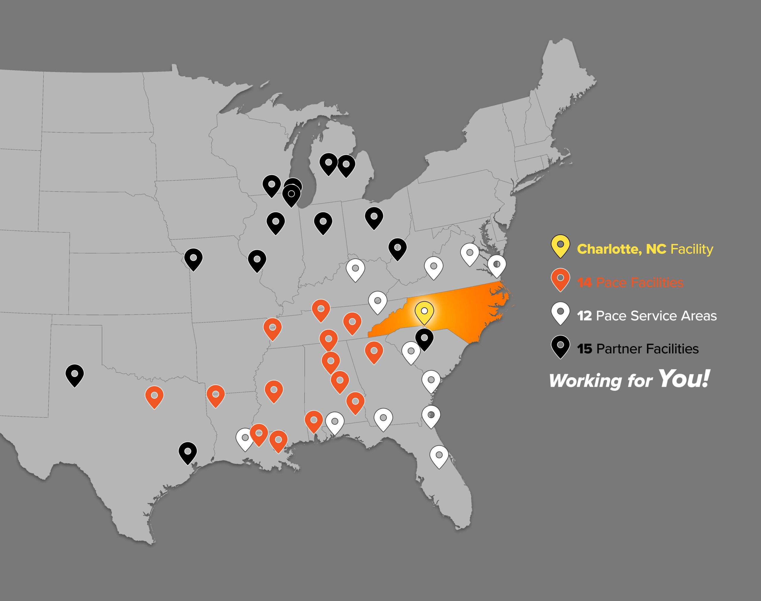 Pace USA is a B2B and B2C logistics provider operating in Charlotte, North Carolina. Pace USA’s Charlotte operation serves shippers across the Carolinas and Virginia with a direct Charlotte-to-Atlanta linehaul in industries including retail, e-commerce, automotive aftermarket, healthcare, business and industrial supply, and hospitality, among others. Our Charlotte facility is located at 5989 Hucks Road, Charlotte, NC 28269, and operates 47,000 square feet of warehouse and distribution space with 13 dock doors. Pace USA Charlotte specializes in last-mile delivery, cross-docking, pool distribution, dedicated route programs, and middle-mile line haul throughout the Carolinas and Southeast.